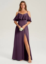 This chic plum bridesmaid dress features a flowing A-line silhouette in smooth fabric, paired with a cold-shoulder ruffle sleeve and V-neck. The sleek V-back adds romantic charm, while the floor-length hem with a side slit delivers timeless elegance—perfect for weddings or formal events.