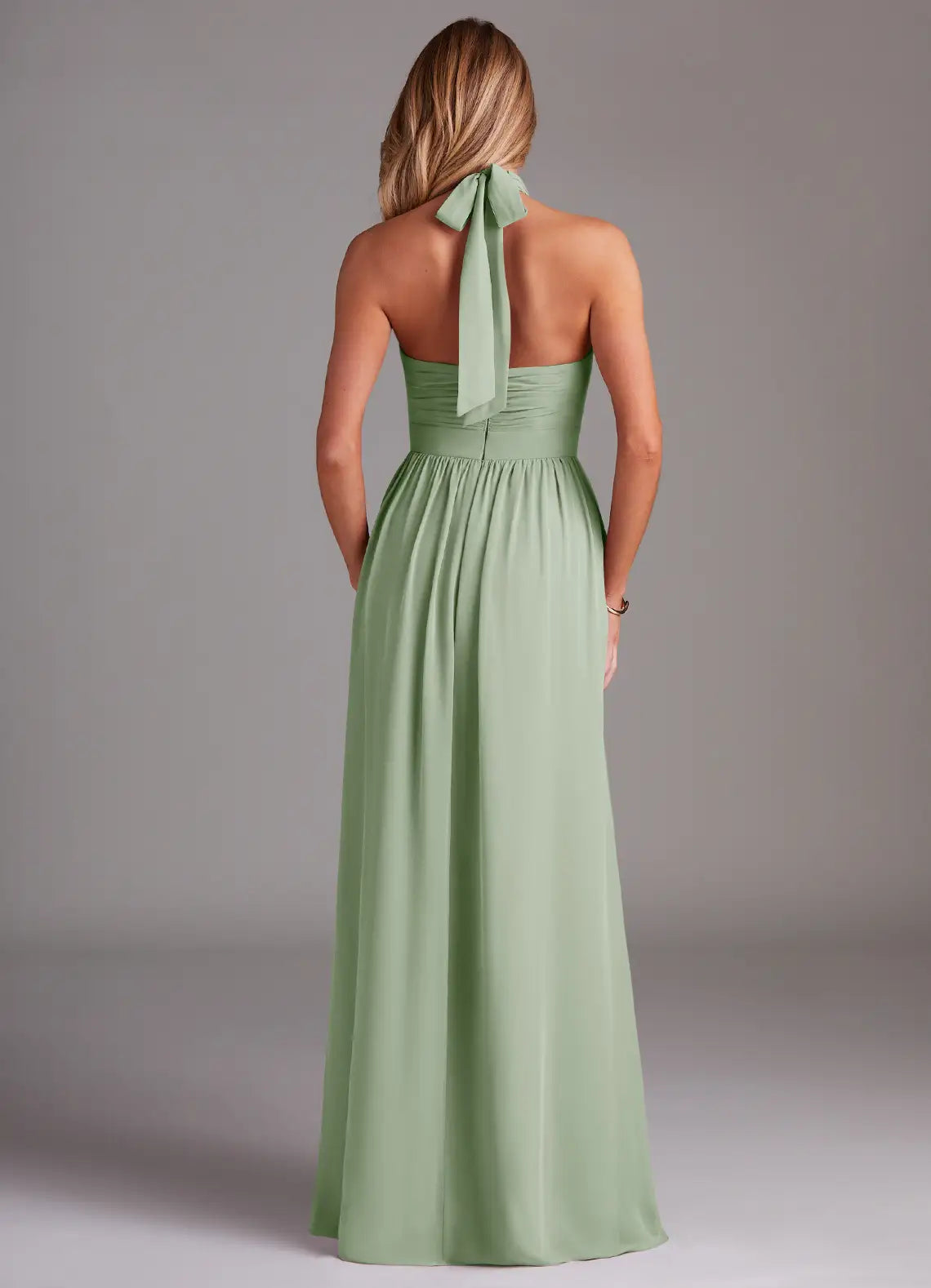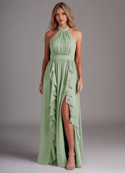 This elegant sage green bridesmaid dress features a flowing A-line silhouette in lightweight chiffon, paired with a halter neck and sleeveless design. The ruffled details & side slit add romantic charm, while the tie-back delivers delicate elegance—perfect for weddings or formal events.