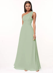 This elegant sage green bridesmaid dress features a flowing A-line silhouette in lightweight fabric, paired with a one-shoulder neckline and sleeveless design. The draped back adds graceful charm, while the floor-length hem delivers timeless elegance—perfect for weddings or formal events.