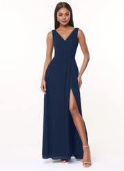 This stunning floor-length bridesmaid dress features an elegant A-line silhouette, a flattering V-neck, sleeveless design, and a graceful cowl back. Crafted in rich navy fabric, it adds a touch of sophistication to any wedding party, with a side slit for subtle movement and comfort. Perfect for formal bridal events, it balances timeless style and modern charm.