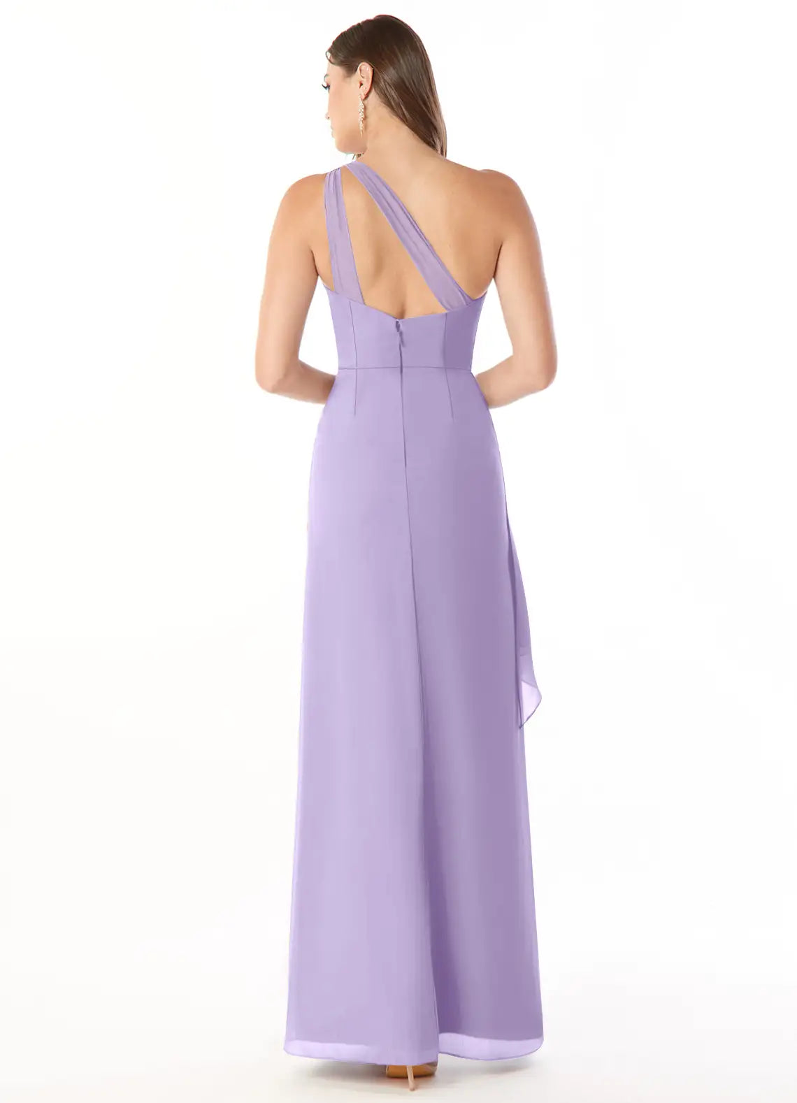This elegant lavender bridesmaid dress features a sleek mermaid silhouette crafted from lightweight chiffon. The one-shoulder design adds modern allure, while the keyhole-back brings delicate charm. A thigh-high slit boosts mobility, and the floor-length hem drapes gracefully—ideal for weddings, receptions, or formal celebrations.