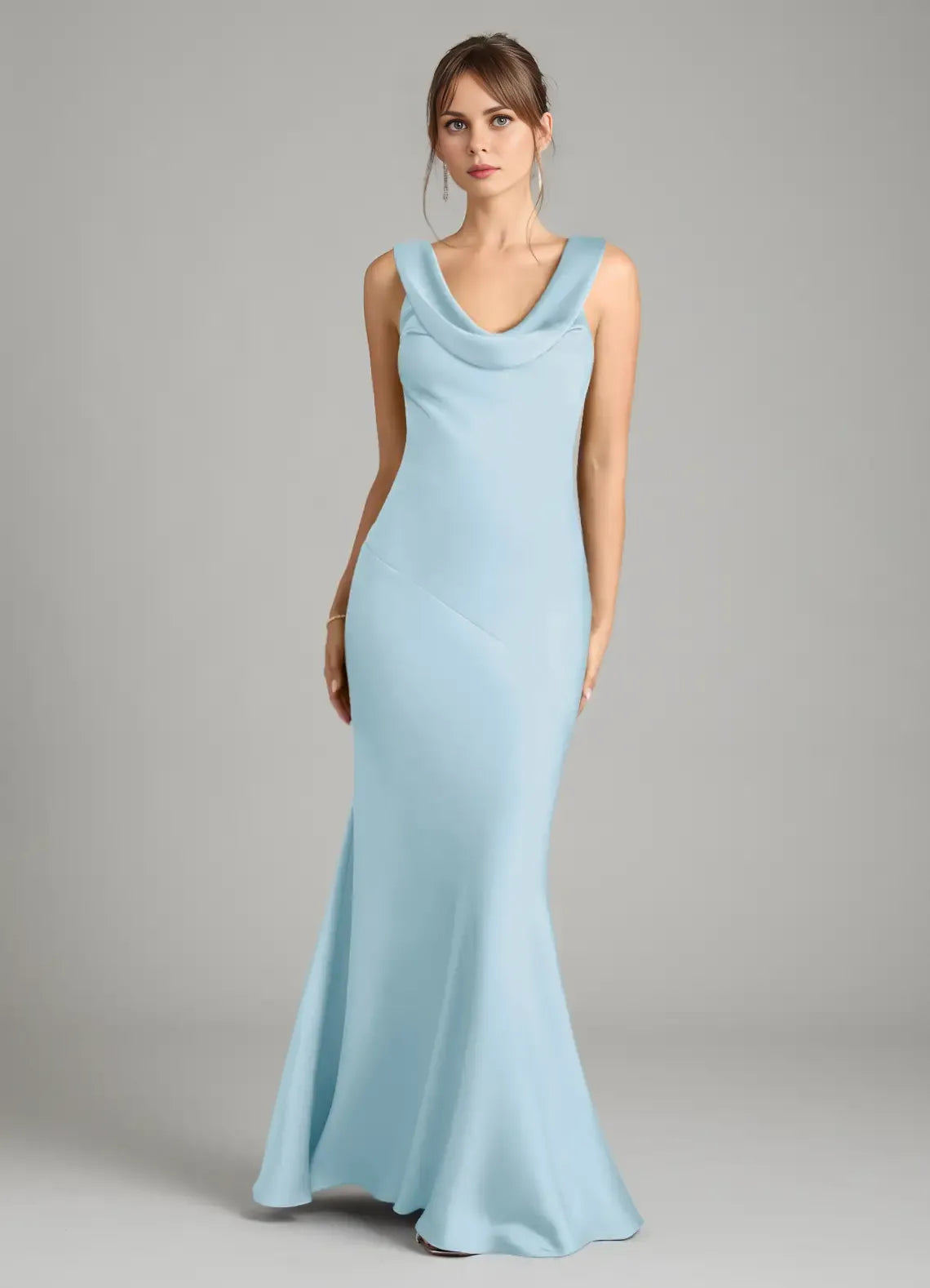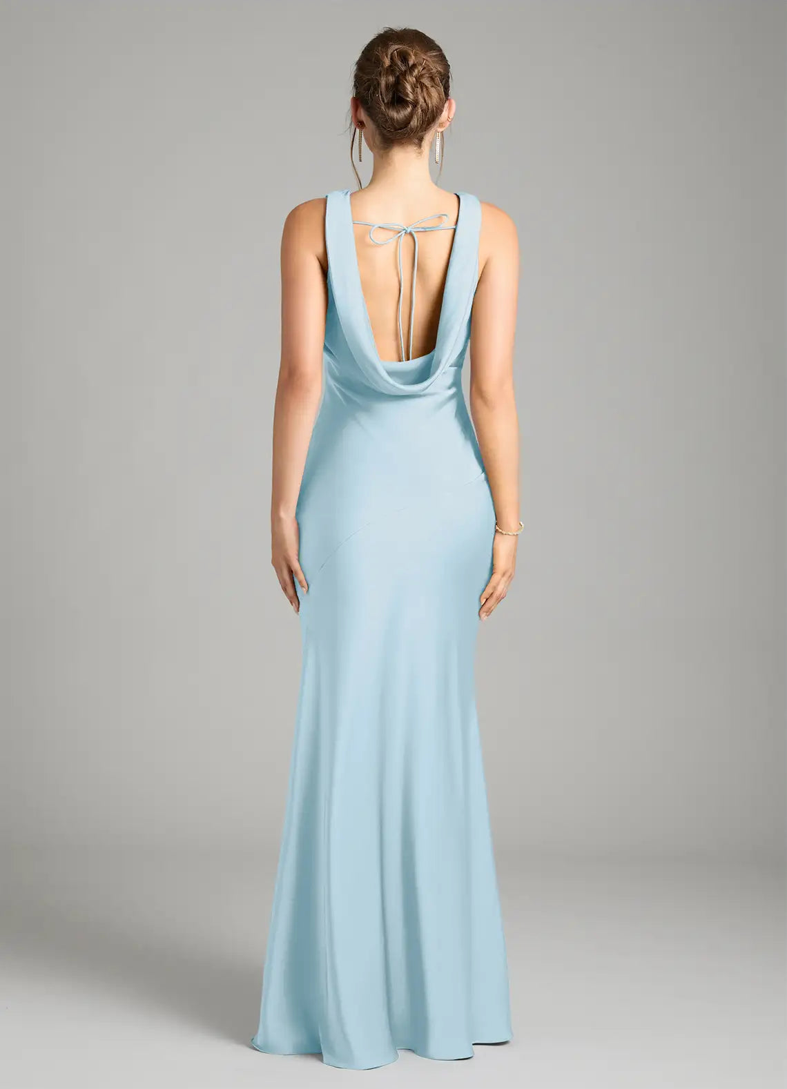 This elegant light-blue bridesmaid dress features a sleek mermaid silhouette crafted from luxe satin. The cowl neckline adds soft sophistication, while the bow-back detail brings feminine charm. The floor-length hem drapes with a lustrous, flowing finish—ideal for weddings, receptions, or formal celebrations.