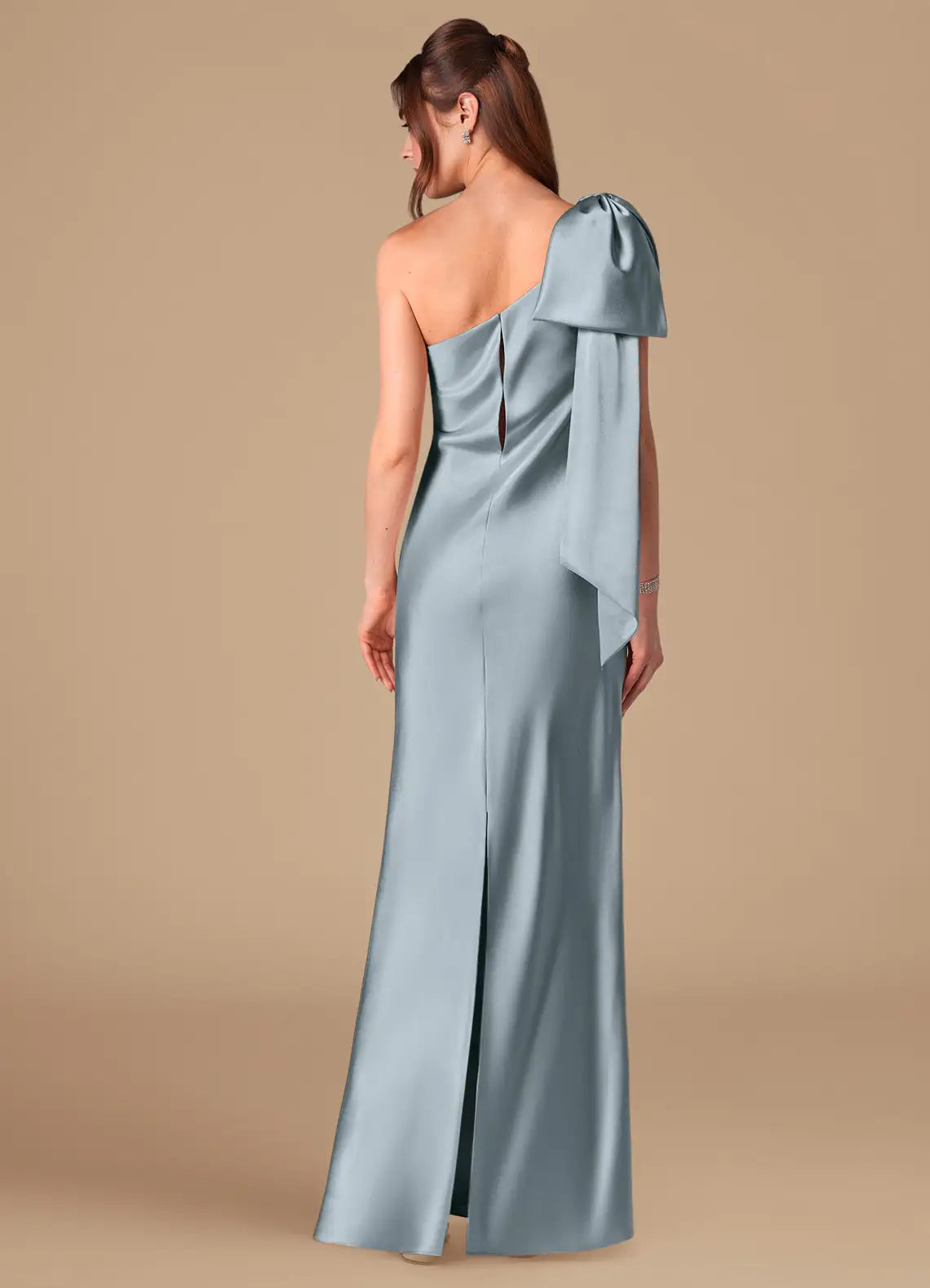 This elegant dusty-blue bridesmaid dress features a sleek mermaid silhouette crafted from luxe satin. The one-shoulder bow sleeve adds romantic charm, while the keyhole-back brings delicate allure. A thigh-high slit boosts mobility, and the floor-length hem drapes with a lustrous finish—ideal for weddings, receptions, or formal celebrations.