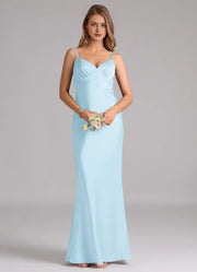 This elegant light-blue bridesmaid dress features a sleek mermaid silhouette crafted from glossy satin. The V-neck and delicate spaghetti straps add soft allure, while the cross-back detail brings modern charm. The floor-length hem drapes with a lustrous finish—ideal for weddings, receptions, or formal celebrations.