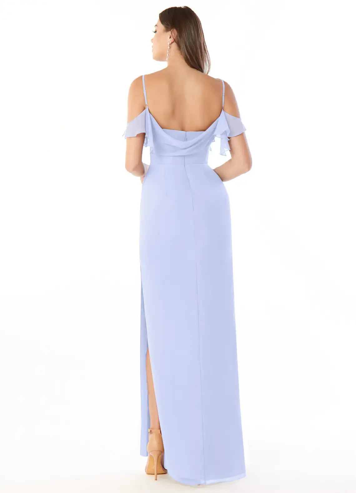This elegant sheath bridesmaid dress features a sweetheart neckline, delicate cold-shoulder ruffle sleeves, and a sleek open back. Crafted from soft light blue fabric, its floor-length silhouette hugs curves with a side slit, adding feminine charm to wedding parties.
