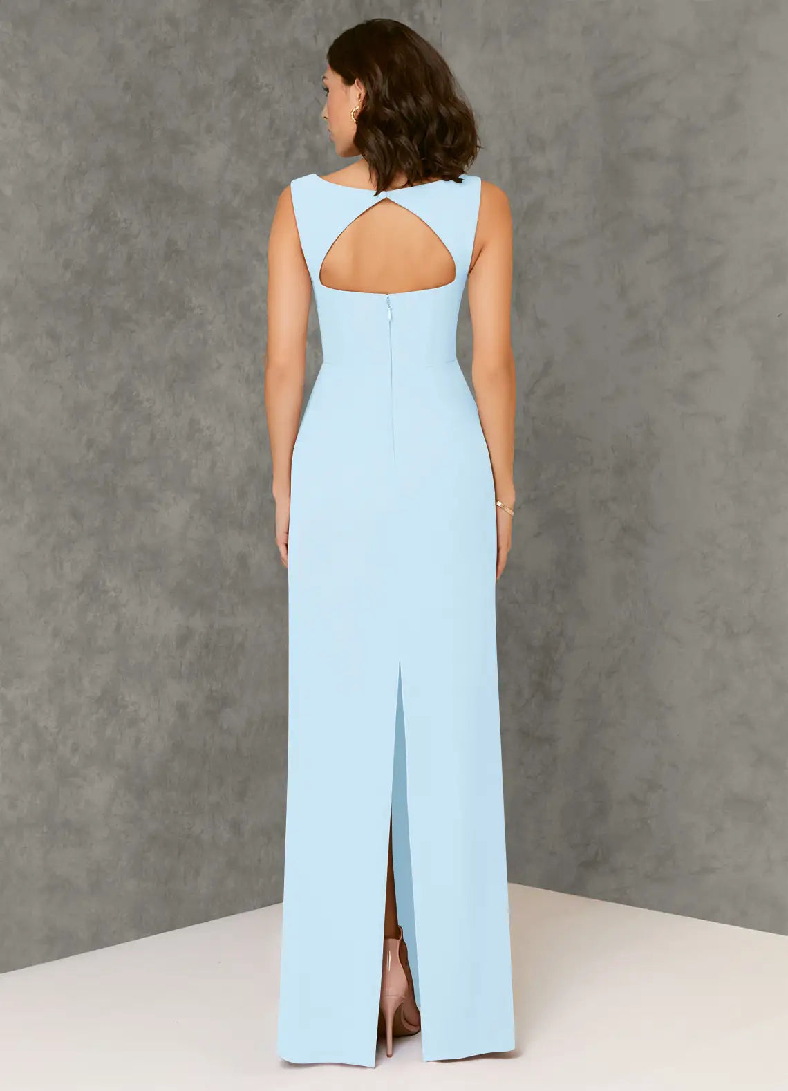 This elegant light-blue bridesmaid dress features a sleek sheath silhouette crafted from soft crepe. The square neck adds refined allure, while the cut-out back detail and back slit bring modern charm. The floor-length hem drapes with a smooth finish—ideal for weddings, receptions, or formal celebrations.