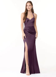 Shine at prom with this luxurious plum mermaid prom dress—featuring a halter-style sweetheart neckline, sleek keyhole back, and lustrous satin fabric. The thigh slit adds modern allure, balancing elegance and drama, perfect for prom, formal dances, or evening galas. Pair with gold accessories to elevate its glamorous vibe.