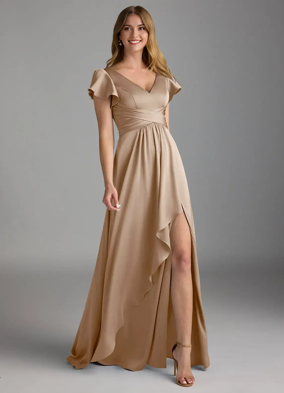 This graceful A-line bridesmaid dress features a flattering V-neck, delicate ruffle short sleeves, and a sleek V-back. Crafted from lustrous champagne satin, it boasts a flowing floor-length silhouette with a subtle side slit for movement. Perfect for wedding parties, it balances soft elegance and modern charm for formal bridal events.