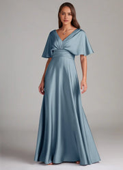 This luxe slate-blue bridesmaid dress features a flowing A-line silhouette crafted from glossy satin. The V-neck and cape sleeves add elegant allure, while the deep V-back detail enhances sophistication. The floor-length hem drapes with a lustrous finish—ideal for weddings, receptions, or formal celebrations.