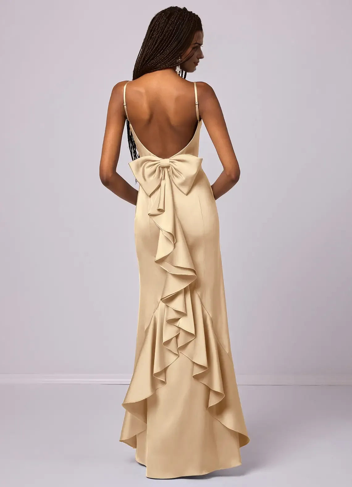 This luxe champagne bridesmaid dress features a sleek mermaid silhouette crafted from glossy satin. The square neckline adds delicate allure, while the back bow and ruffle detail bring elegant charm. The floor-length hem drapes with a lustrous finish—ideal for weddings, receptions, or formal celebrations.