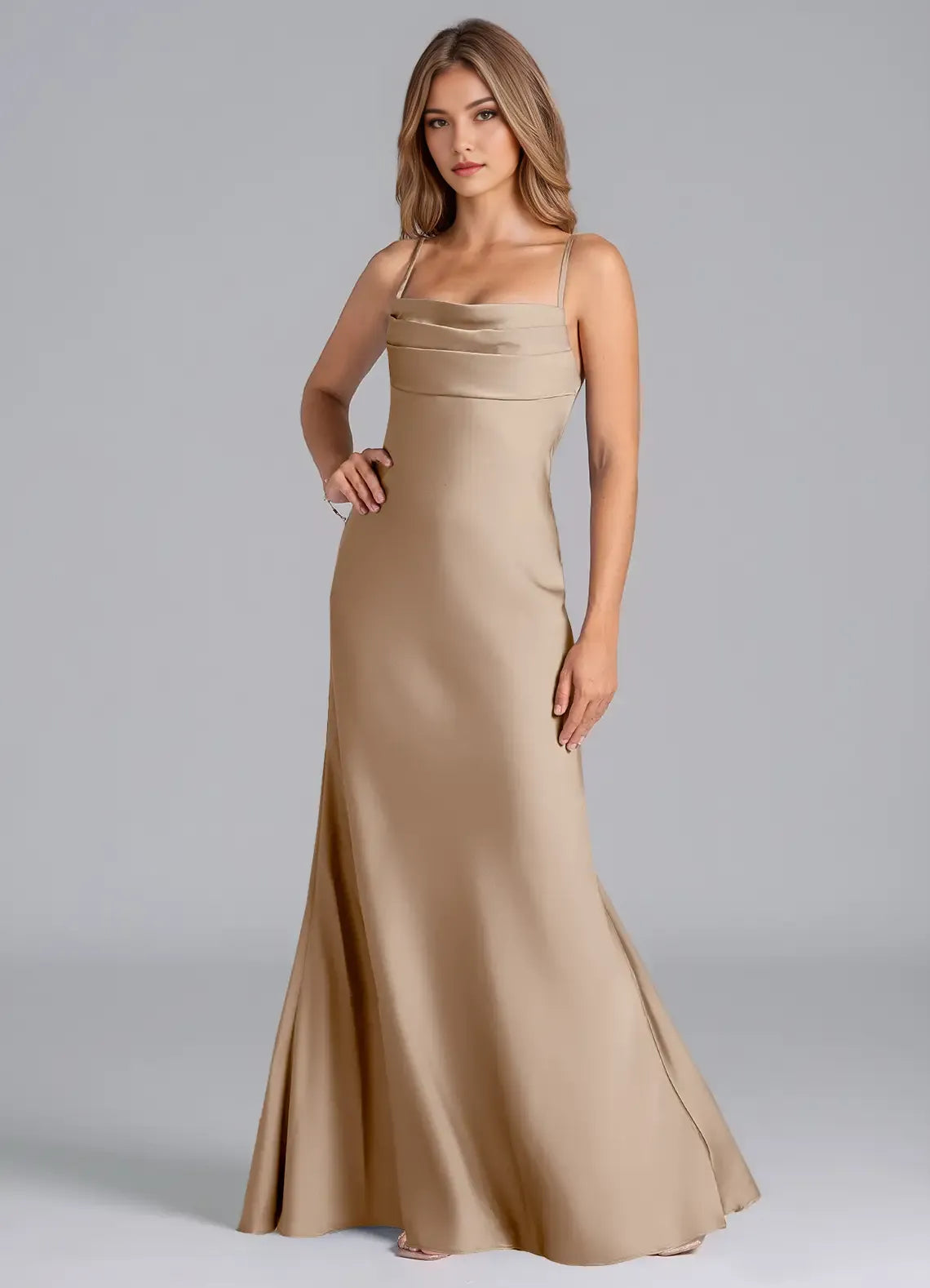 This luxe mermaid bridesmaid dress features a sleek square neck, sleeveless spaghetti straps, and a romantic crisscross tie-back. Crafted from smooth champagne satin, its floor-length flared silhouette hugs curves elegantly, adding timeless glamour to wedding parties and formal bridal events.