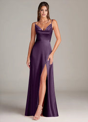 This luxe plum bridesmaid dress features a sleek sheath silhouette crafted from glossy satin. The cowl neck adds elegant allure, while the spaghetti straps and thigh-high slit bring modern charm. The open-back detail enhances sophistication, and the floor-length hem drapes with a lustrous finish—ideal for weddings, receptions, or formal celebrations.