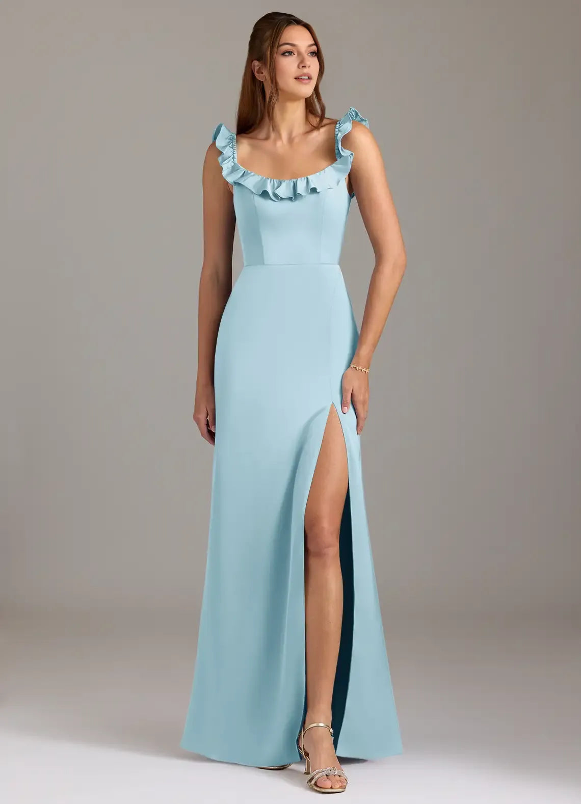 This luxe light blue bridesmaid dress features a sleek sheath silhouette in satin, paired with a square neck, ruffle cold-shoulder sleeves, and a chic keyhole back. The side slit adds alluring charm, delivering timeless elegance—perfect for weddings or formal events.