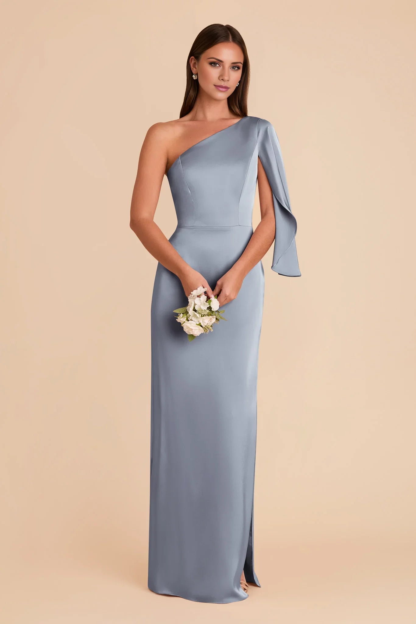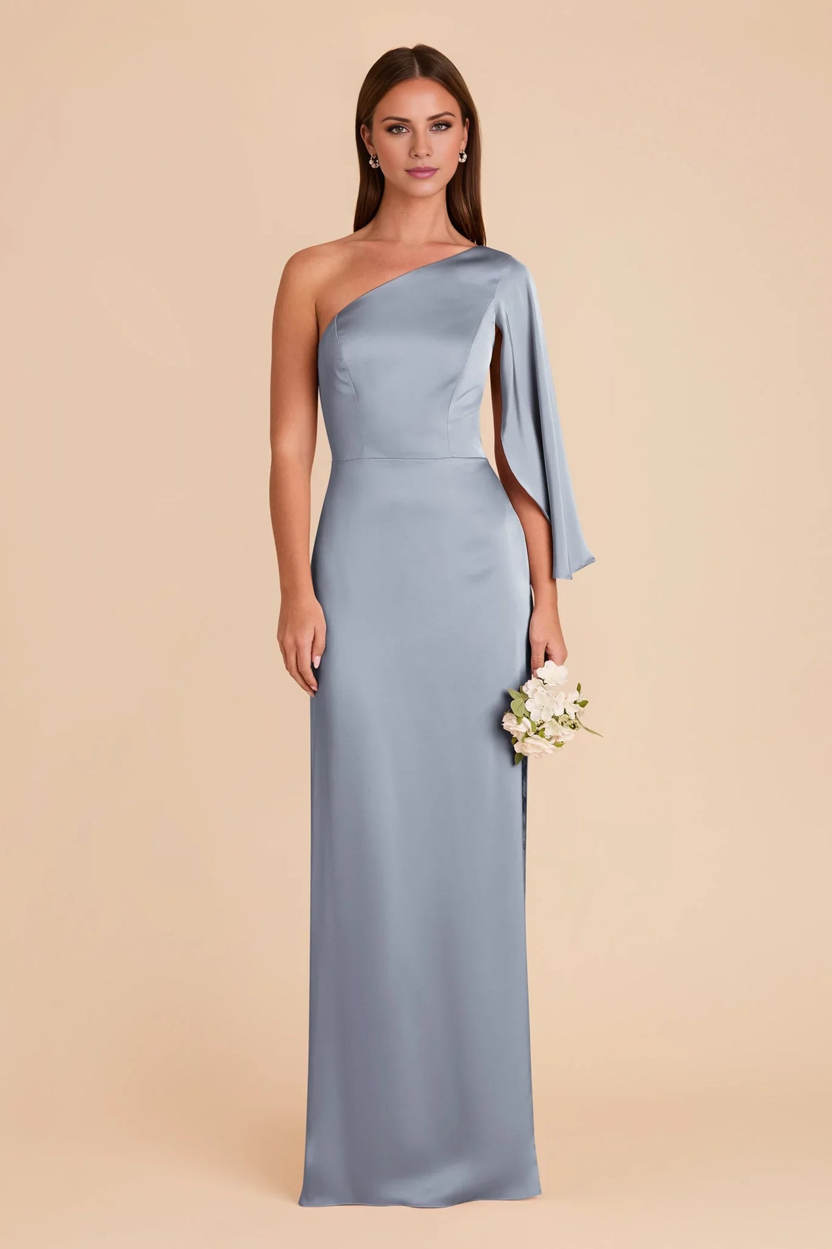 This dusty blue maxi dress features a lustrous satin silhouette, a sleek one-shoulder neckline (paired with a dramatic cape sleeve for modern flair), and a form-fitting skirt. The smooth fabric and bold design balance sophistication and contemporary style—ideal for formal weddings, evening receptions, or upscale bridal events, creating a cohesive, statement-making look for bridal party ensembles.