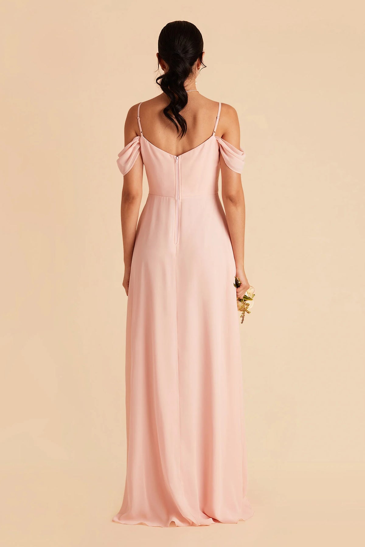 This romantic blush bridesmaid dress features a flowing A-line silhouette crafted from lightweight chiffon. The cold-shoulder neckline and delicate flutter sleeves add soft charm, while the zipper-back ensures a seamless fit. A thigh-high slit boosts mobility, and the floor-length hem drapes gracefully—ideal for weddings, receptions, or formal events.