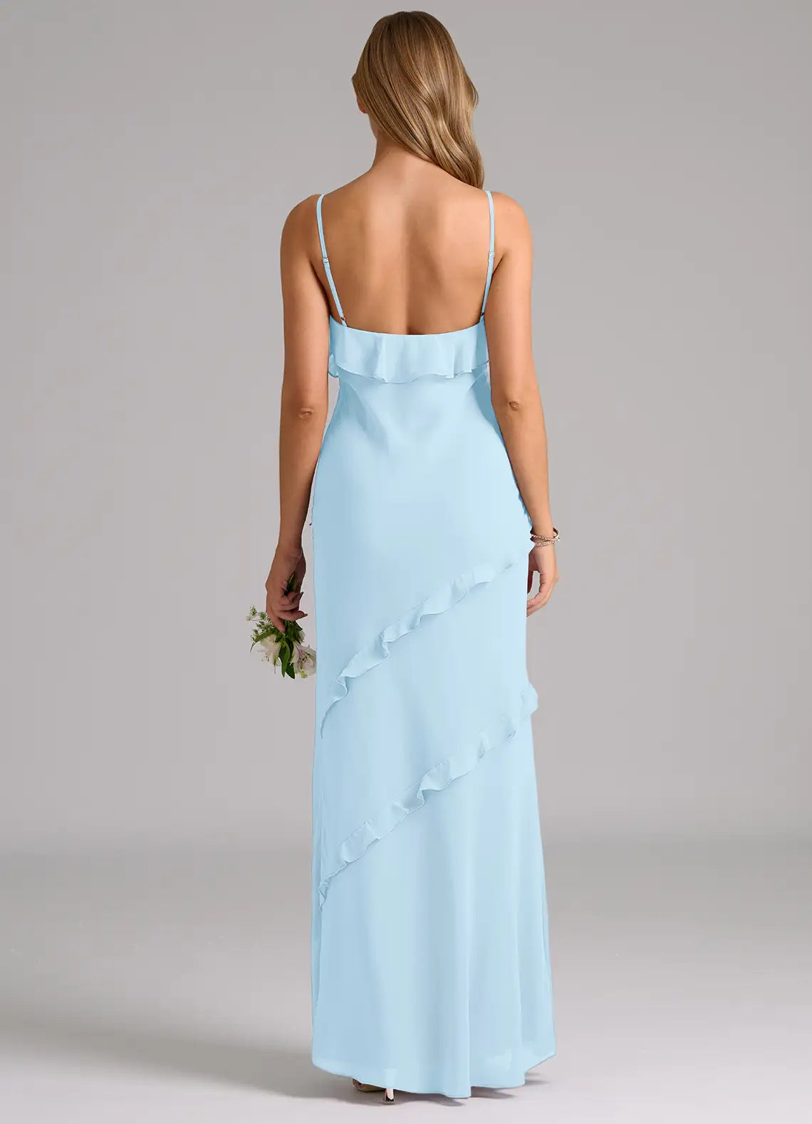 This romantic light-blue bridesmaid dress features a sleek sheath silhouette crafted from soft chiffon. The V-neck adds gentle allure, while the spaghetti straps and cascading ruffle detail bring playful charm. The thigh-high slit boosts mobility, and the floor-length hem drapes with an airy finish—ideal for weddings, receptions, or formal celebrations.