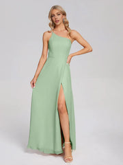 Simple A-line One Shoulder Sleeveless Chiffon Slit Floor-Length Bridesmaid Dress