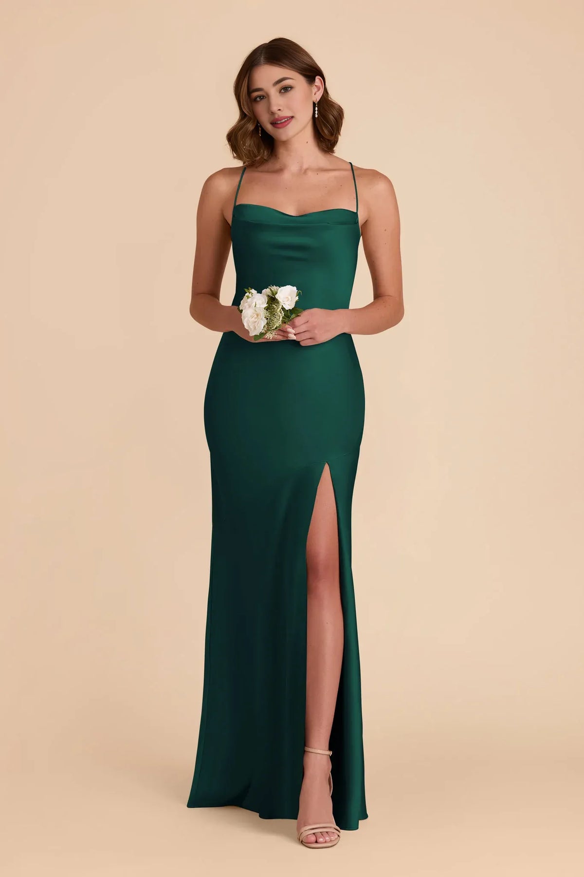 This luxe emerald gown features delicate spaghetti straps, a sweetheart neckline, and a sleek satin mermaid silhouette with a dramatic high slit. The cross-back tie design adds modern allure, while the smooth fabric delivers a rich sheen—ideal for weddings, galas, or upscale evening events.
