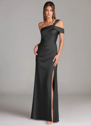 This sleek black bridesmaid dress features a figure-hugging mermaid silhouette crafted from luxe satin. The one-shoulder cold-shoulder design adds modern allure, while the open back brings elegant charm. A thigh-high slit boosts mobility, and the floor-length hem drapes with a lustrous finish—ideal for weddings, receptions, or formal events.