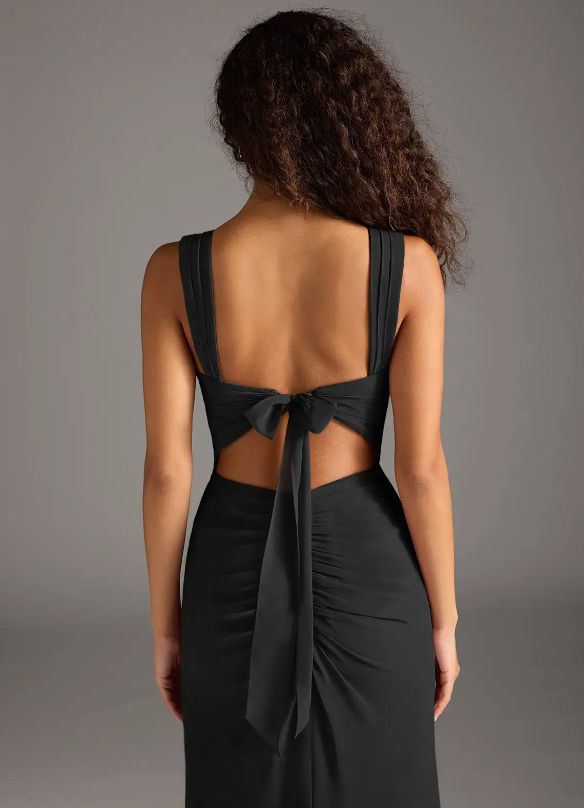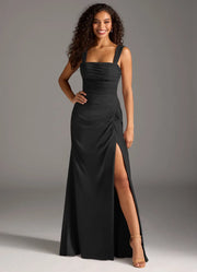 This elegant bridesmaid dress features a modern square neckline, wide structured straps, and a flowing A-line silhouette with a high side slit. Crafted from premium chiffon, it offers a flattering fit with a self-tie back closure and ruched side detail. Ideal for weddings, bridal parties and formal occasions to showcase a refined, feminine style.