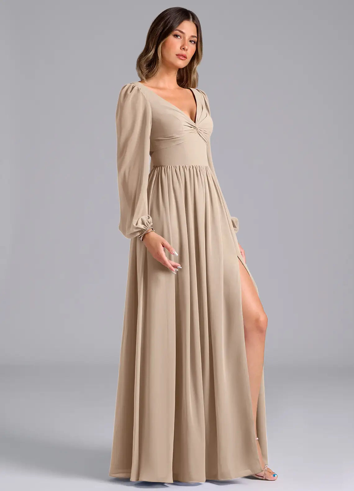 Create a romantic bridal party look with this taupe chiffon bridesmaid dress, designed for comfort and modern elegance. Crafted from lightweight, flowy chiffon, it features a deep V-neckline with a ruched bodice, billowy long sleeves with elasticized cuffs, and a flowy A-line skirt with a chic high side slit. The open back with a self-tie detail adds a touch of allure, making it ideal for spring, summer, and outdoor weddings.