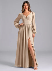 Taupe Chiffon Long Sleeve Bridesmaid Dress with Back Tie, Ruched Bodice and High Slit
