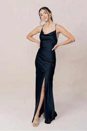 Sultry Cowl Neck Criss-Cross Back Satin Mermaid Bridesmaid Dress with High Side Slit