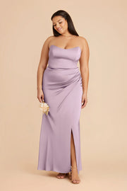 Dusty Lavender Satin Strapless Bridesmaid Dress Ruched Waist High Slit Sheath Maxi Wedding Gown - US 2 / UK 6 / EU 32