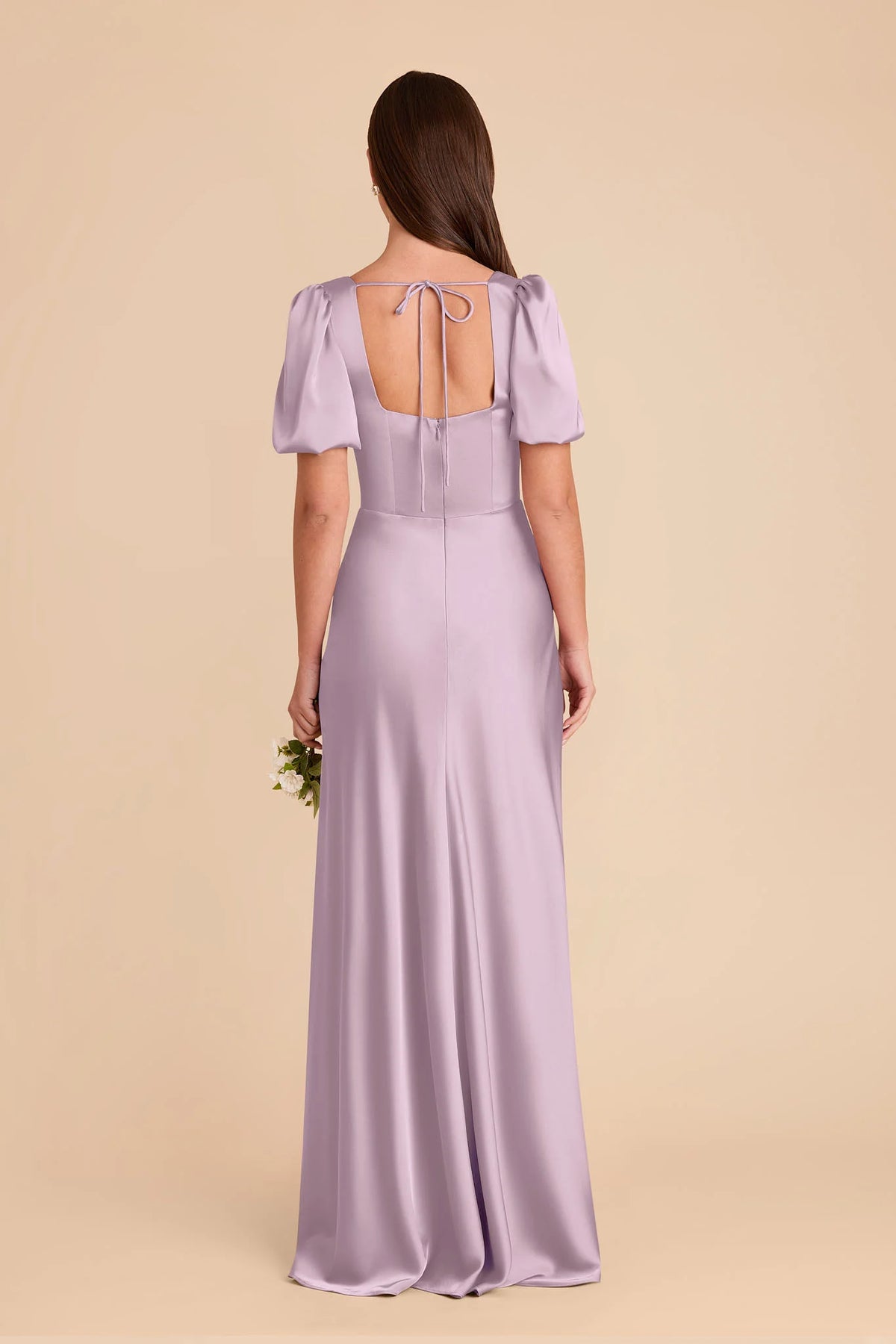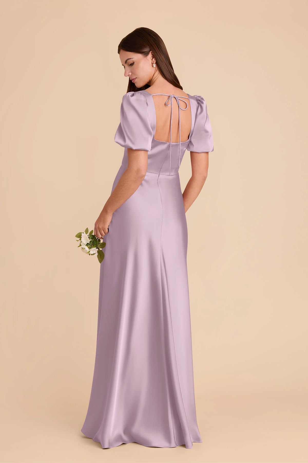 Square Neck Puff Short Sleeve Satin Bridesmaid Dress Back Tie High Slit A Line Floor Length Wedding Guest Formal Gown