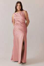 This sleek blush pink gown features a classic square neckline, adjustable tie shoulder straps, and a high slit that balances grace and mobility. The satin fabric delivers a luxurious sheen, while the low open back and ruched side detailing enhance the silhouette—ideal for weddings, bridal parties, or upscale evening events.