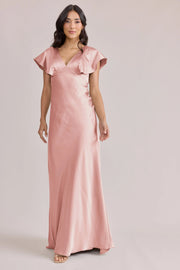 Blush Pink V-neck Ruffled Cap Sleeve Satin Bridesmaid Dresses with Open Back
