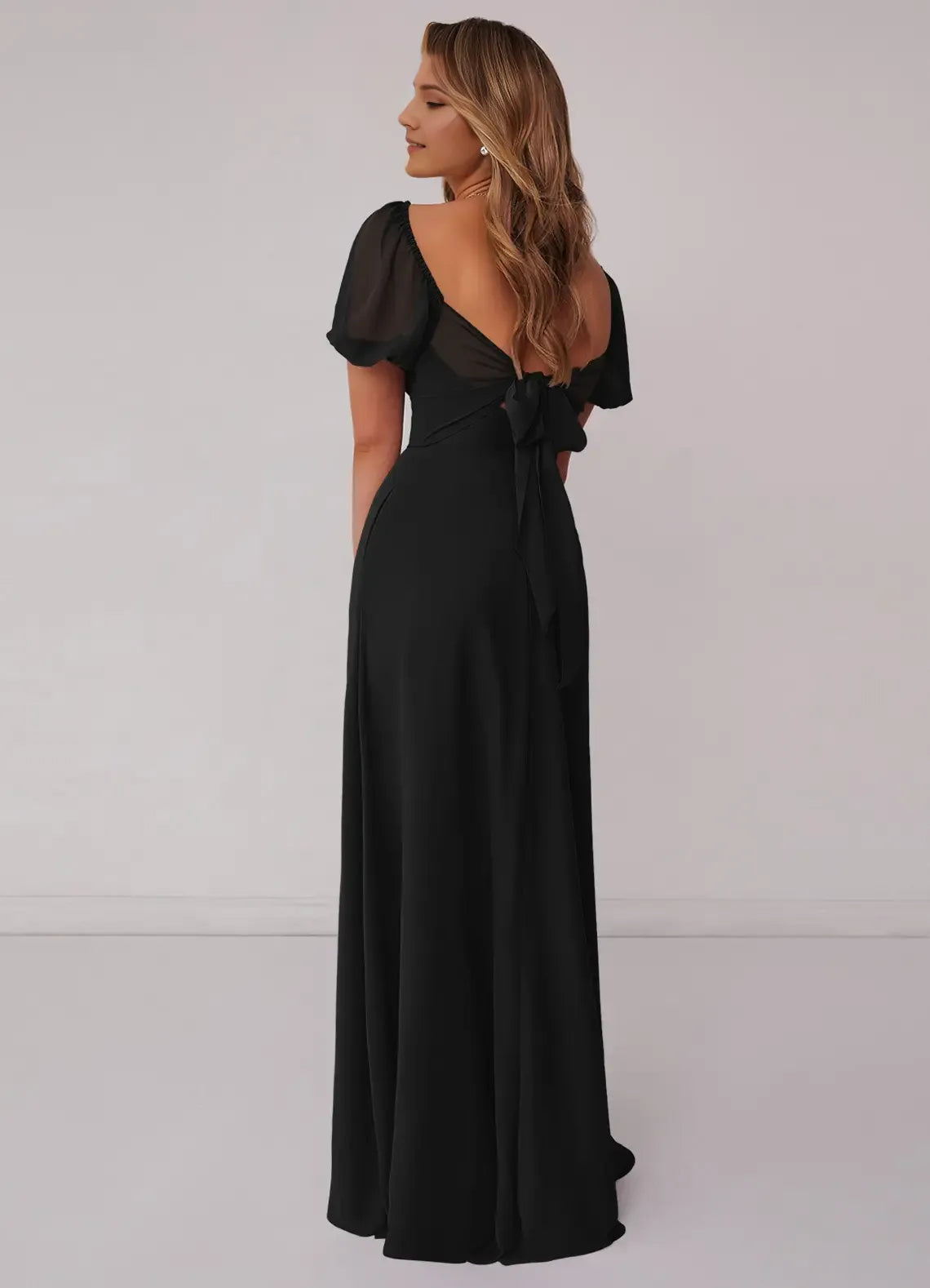 This charming black bridesmaid dress features a flowing A-line silhouette crafted from lightweight chiffon. The sweetheart neckline and sheer puff sleeves add soft charm, while the bow-back detail brings delicate allure. Side pockets boost practicality, and the floor-length hem drapes gracefully—ideal for weddings, receptions, or formal celebrations.