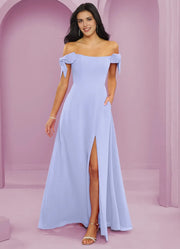 This charming A-line bridesmaid dress features an off-the-shoulder neckline, playful bow sleeves, and a sleek scoop back. Crafted from soft light blue chiffon, its floor-length silhouette flows with a side slit (plus pockets) for comfort, adding feminine elegance to wedding parties.