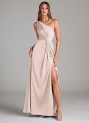 This charming champagne bridesmaid dress features a flowing A-line silhouette crafted from luxe satin. The one-shoulder design adds modern allure, while the zipper-back ensures a sleek fit. A thigh-high slit boosts mobility, and the floor-length hem drapes with a lustrous finish—ideal for weddings, receptions, or formal celebrations.