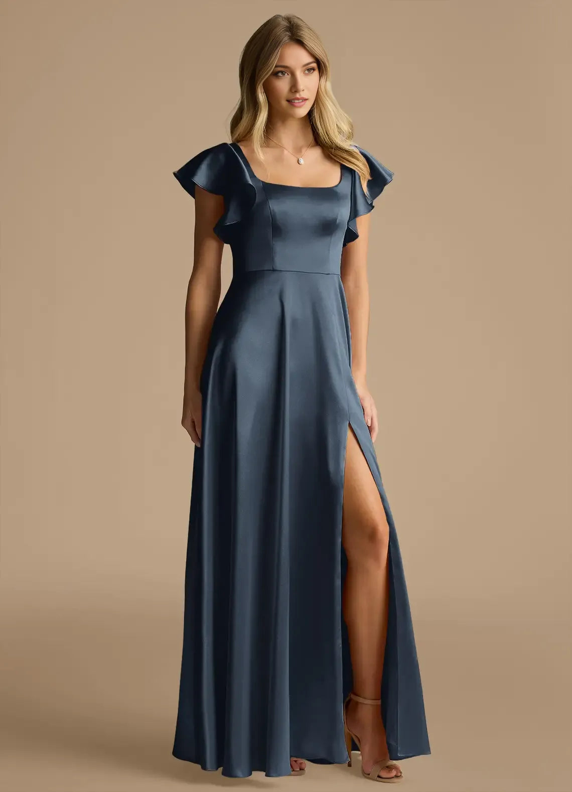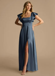 This charming A-line bridesmaid dress features a classic square neck, delicate ruffle short sleeves, and a romantic tie-back. Crafted from sleek slate blue satin, its floor-length silhouette flows gracefully with a side slit for movement. Perfect for wedding parties, it blends soft elegance and modern flair for formal bridal events.