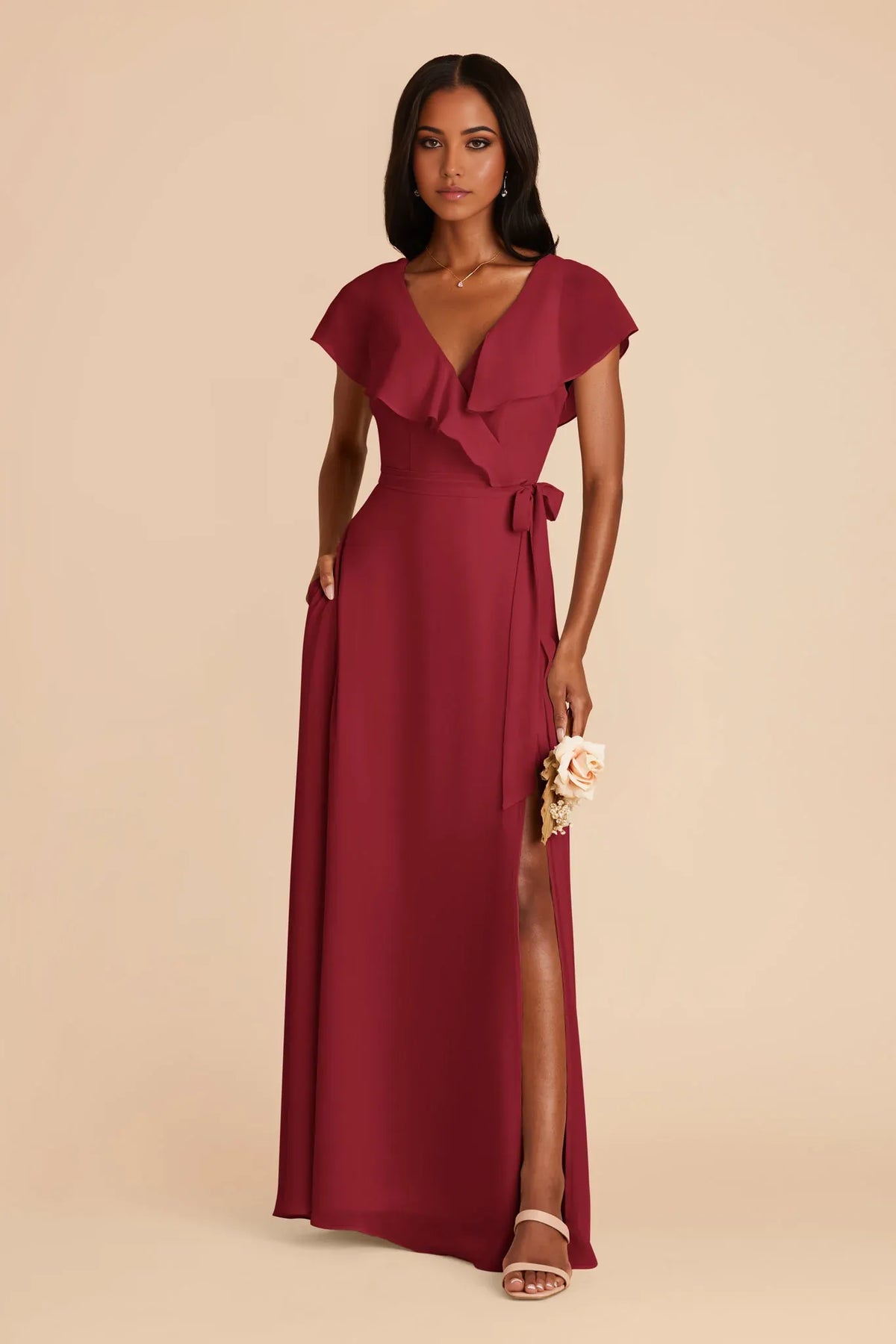 This Ruffle Sleeve back side zip bridesmaid dress does not include any accessories shown in the image, such as a cape, jacket, gloves, veil, or handbag.