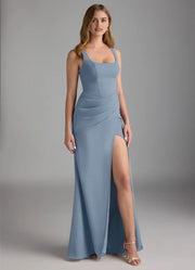 This charming dusty-blue bridesmaid dress features a sleek sheath silhouette crafted from lightweight chiffon. The square neckline adds delicate allure, while the cross-back detail and thigh-high slit bring modern charm. The floor-length hem drapes with an airy finish—ideal for weddings, receptions, or formal celebrations.