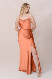 Chic Cowl Neck Cross-Back Spaghetti Strap Button-Detail High Slit Mermaid Floor-Length Bridesmaid Dress