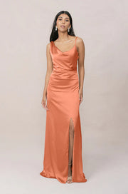 Satin Cowl Neck Bridesmaid Dress with Asymmetric Back Draping & High Front Slit