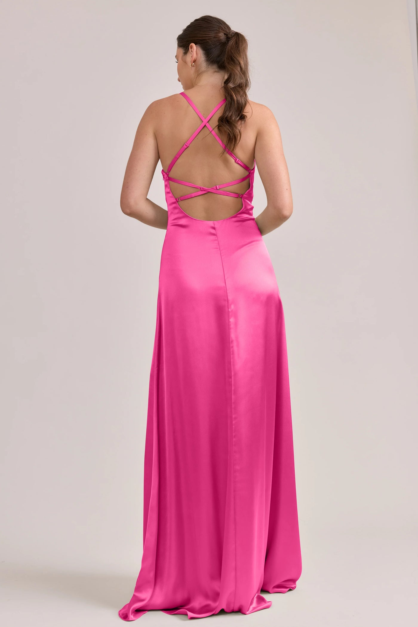 Romantic V-Neck Hot Pink Satin Bridesmaid Dress with Crisscross Back Straps, High Thigh Slit & Floor-Length Hem