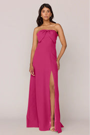 Satin Strapless Bridesmaid Dresses with Bow Detail, Lace-Up Back and High Slit Formal Gown