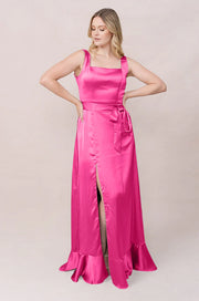 This glamorous bridesmaid dress is crafted from premium, glossy satin, featuring a modern square neckline with wide shoulder straps that can be tied into elegant bows for a customizable, romantic look. The waist is adorned with a matching satin sash that can be styled into a bow, accentuating the figure and adding a touch of sophistication. The flowing A-line skirt features a high thigh slit for added movement and allure, as well as a ruffled hem that adds a playful, feminine touch. Made with high-quality satin fabric and a soft, comfortable lining, it is ideal for weddings, bridal parties, formal galas, and all upscale evening occasions.
