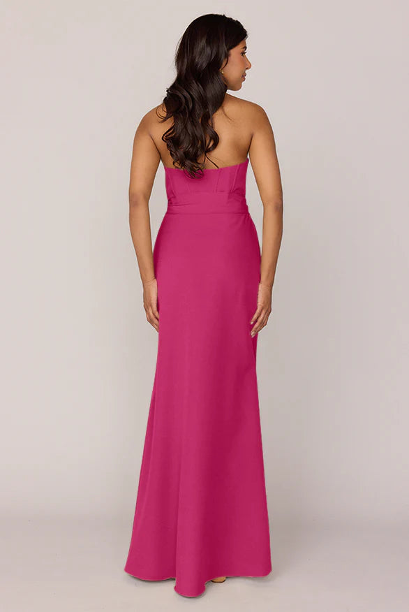 This elegant bridesmaid gown is crafted from smooth, luxurious satin, featuring a structured strapless corset bodice. The waist sash detail adds a polished touch, while the high front slit brings a modern edge. Perfect for wedding parties and formal occasions.