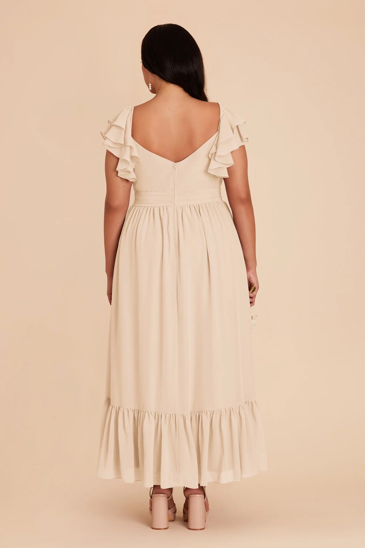 This feminine dress features a V-neckline with ruffled shoulder details, paired with a pleated bust and flowy midi skirt (finished with a ruffled hem) for soft movement. The open-back design adds elegant charm, while the lightweight fabric ensures comfort. In a warm champagne hue, it’s ideal for bridesmaid roles, garden weddings, and semi-formal events—blending romantic style with practical wear.