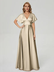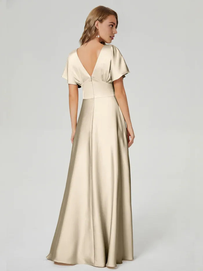Simple A-line V-neck Short Sleeves Satin Pleated Floor-Length Bridesmaid Dress - US 2 / UK 6 / EU 32