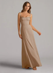 Made from smooth taupe satin, this bridesmaid dress features a classic sweetheart neckline and a functional corset back for a perfect fit. Its flowing A-line maxi skirt delivers effortless elegance, ideal for every wedding theme and bridal party look.