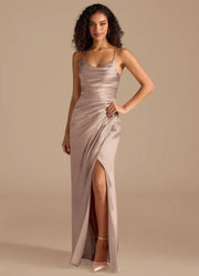 Bridesmaid Dresses Luxe Satin Cowl Neck Ruched Bodice Adjustable Spaghetti Strap High Slit Floor-Length