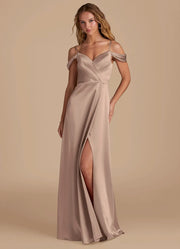 Bridesmaid Dresses Luxe Satin Off-Shoulder Adjustable Spaghetti Strap High Slit Floor-Length Gown
