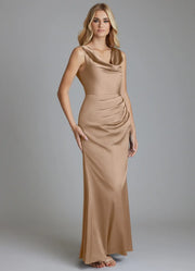 Champagne Satin Cowl Neck Bridesmaid Dress with Ruched Bodice, Open Back and Mermaid Silhouette - US 2 / UK 6 / EU 32