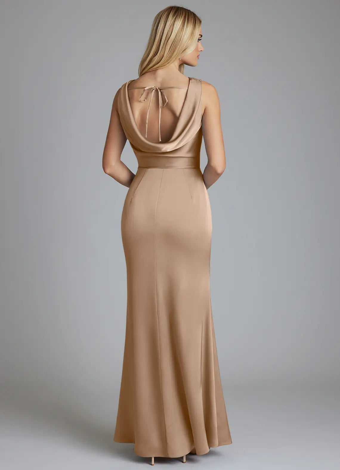 Champagne Satin Cowl Neck Bridesmaid Dress with Ruched Bodice, Open Back and Mermaid Silhouette